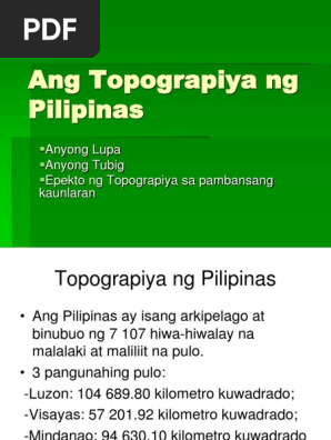 Ng Pil ipLupa Anyong ina s Anyong Tubig Epekto ng Topograpiya sa pambansang kaunlaran Topograpiya ng Pilipinas Ang Pilipinas ay isang arkipelago at binubuo ng 7 107 hiwa-hiwalay na malalaki at maliliit na pulo. Mga likas na yaman ng pilipinas. 28062017 Topograpiya isang aghan na may kinalaman sa pag-aaral ng mga katangiang pisikal o ng pang ibabaw ng mga katangian ng isang lugar o bansa.