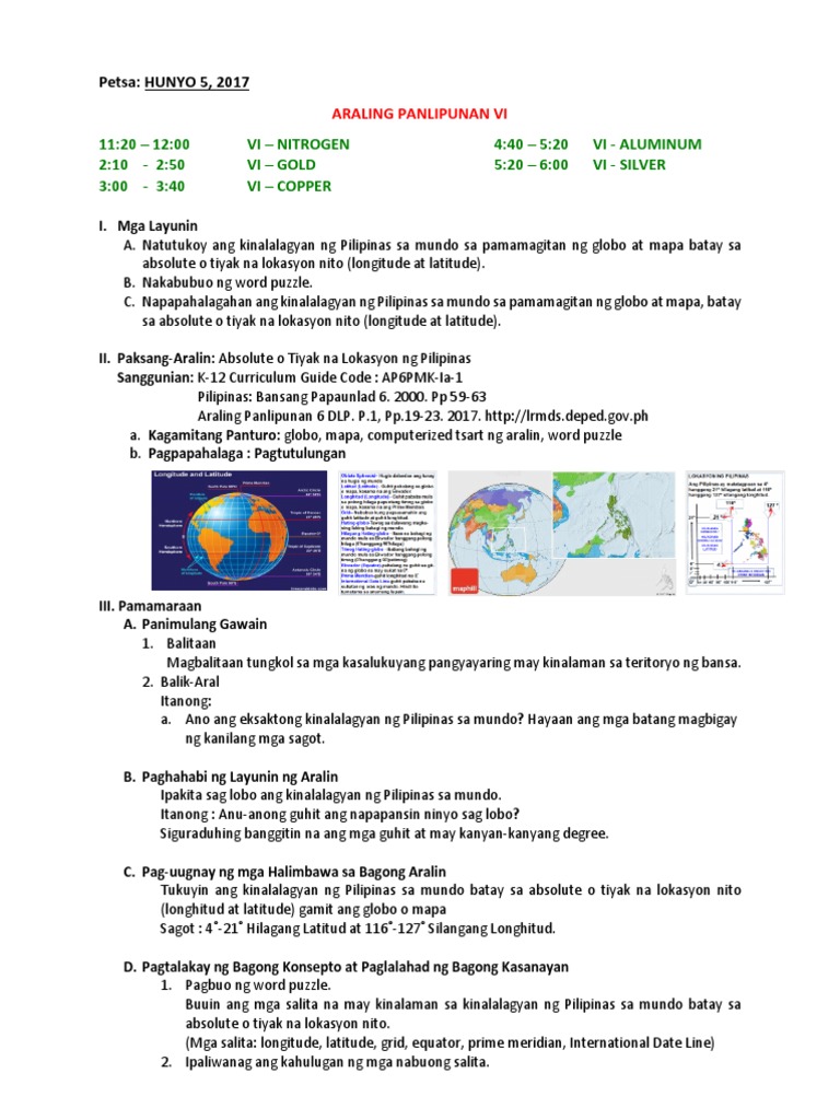 Ginagamit ang grid sa pagtukoy ng tiyak na kinalalagyan ng isang lugar sa mundo. Ang Pilipinas naman kung titignan ang lawak na heograpikal o geographical extent ay matatagpuan sa pagitan ng mga latitud na. LOKASYON- tumutukoy sa kinaroroonan ng mga lugar sa daigdig.
